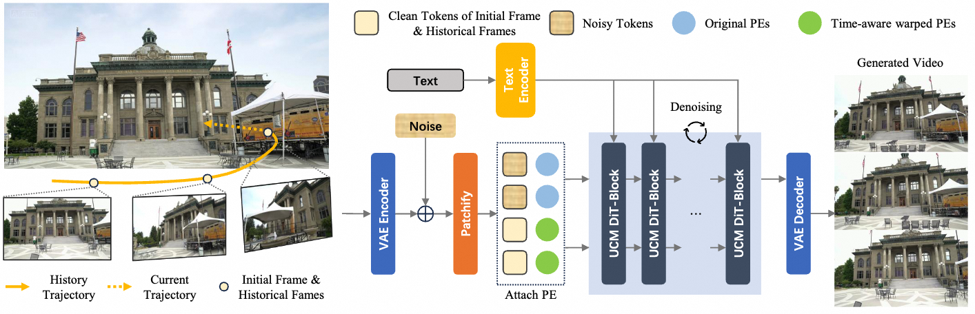 UCM, a novel framework that unifies long-term memory and precise camera control via a time-aware positional encoding warping mechanism.